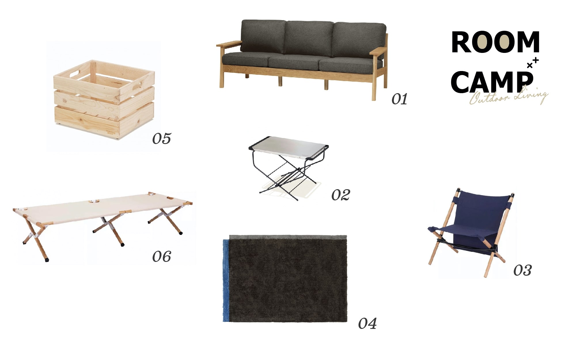 01.SIEVE merge sofa 3seater(DGR) 02.HangOut Fire Side Tableステンレストップ 03.HangOut Pole Low Chair(NV) 04.SIEVE BLEND Rug(BR) 05.HangOut Multi Wood Box 06.HangOut Apero Wood Cotto(WH)