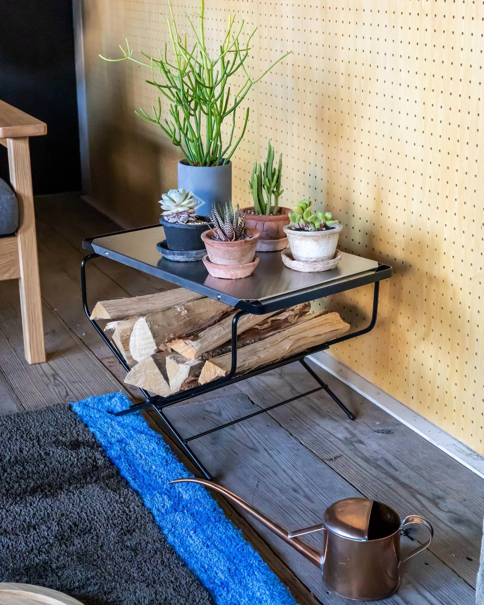 ファイヤーサイドテーブルは、焚き火の薪を置くスタンドテーブルとして重宝するアウトドアギアですが、ソファのサイドテーブルとしても最適です。