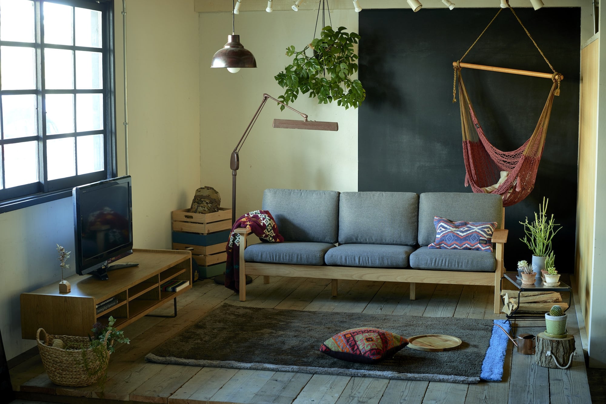 コットの代わりにTVボードを置く事で、ソファ+ローボードメインのスタンダードなリビングスタイルに。