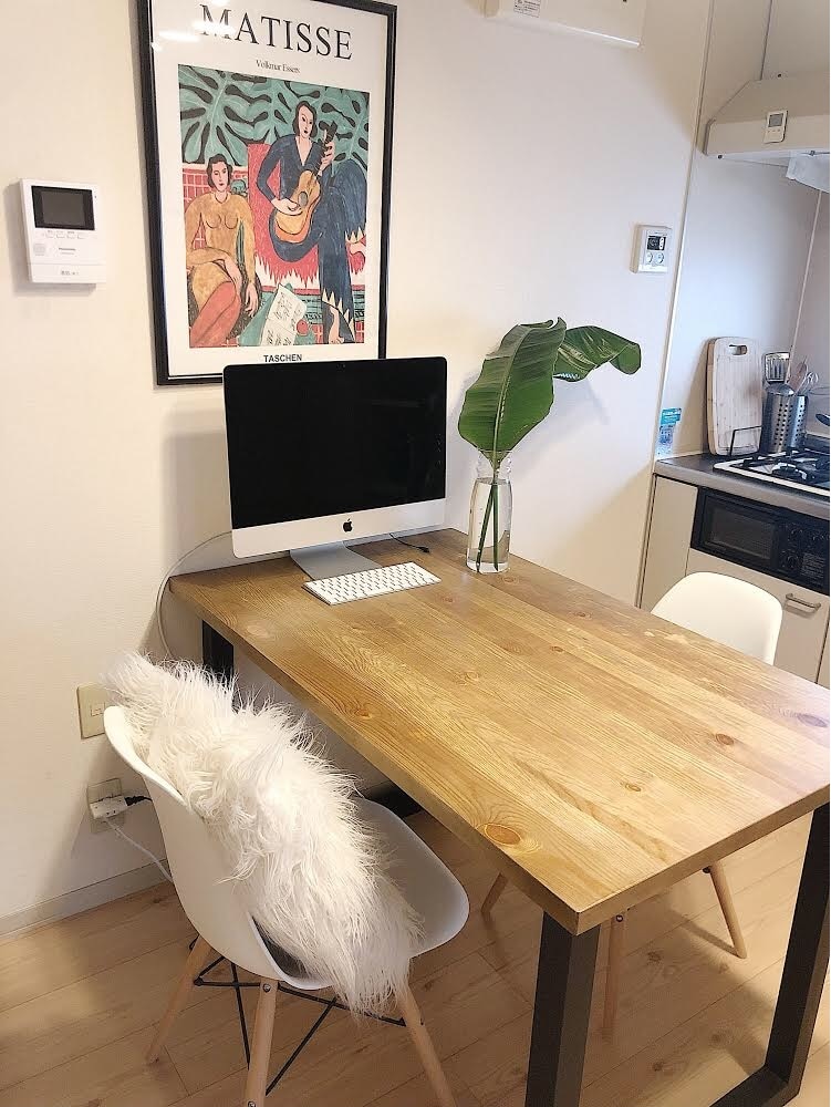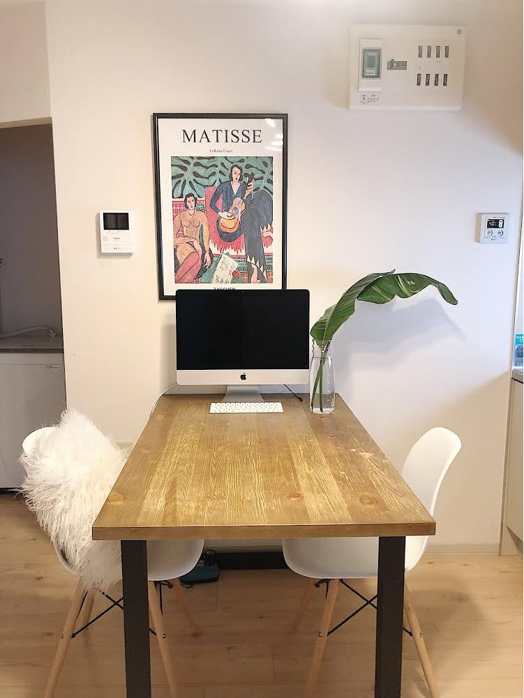 "7畳程度のダイニングルームでは仕事をしたりごはんを食べたり。基本的に白、黒、木目、グリーンで統一しています。大きな額縁に入れたアートがお気に入り。家具がシンプルなぶん、アートで遊びを足します。"