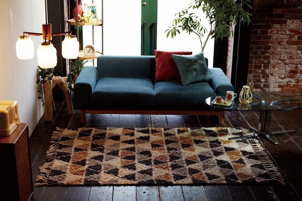 上の写真のようにお部屋の色彩は紺と青緑がメイン。ラグに茶色やオレンジの意匠を取り入れると、遊び心のあるインテリアになります。それでも、お部屋の統一感はしっかりしています。