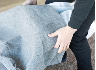 カバーの向きを確認し、均等にカバーを差し込みます。クッションを折り曲げるのが難しいようであれば、床に傷がつかないようラグなどを敷き、軽く体重をかけて曲げる方法もございます。