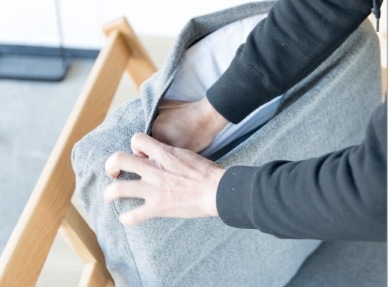クッションが全て入りましたら、ファスナーを閉める余裕を確認してください。 クッションの四隅が合っていないとファスナーを閉める際に、無理な力が加わりますので、クッションを手のひらでパンパンと数回叩いてください。クッション中材がカバーの形に馴染んでいきます。 無理に力を加えると、生地やファスナーが破損する恐れがありますのでご注意ください!