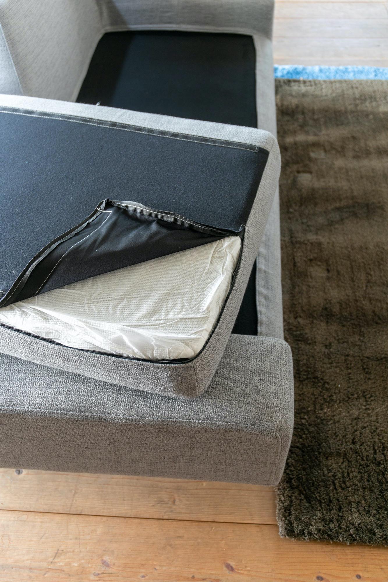 本体、座クッションともにカバーリング仕様なので、はがしてドライクリーニングでお洗濯していただけ、清潔にご使用いただけます。