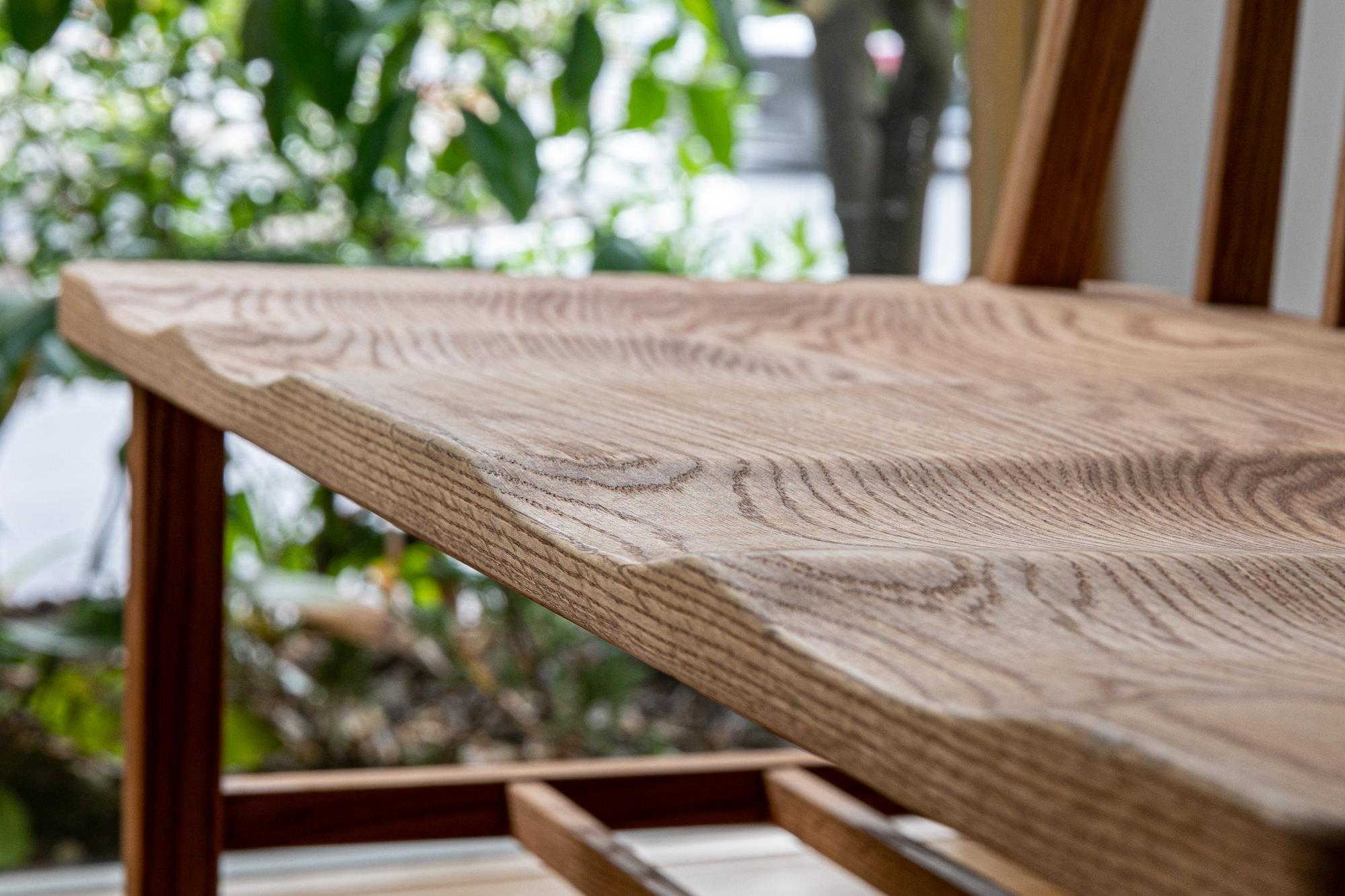 ダイニングチェア、ダイニングアームチェア、ダイニングハイバックベンチは、座面がお尻にフィットするように板を削り込む『座ぐり』を施しました。