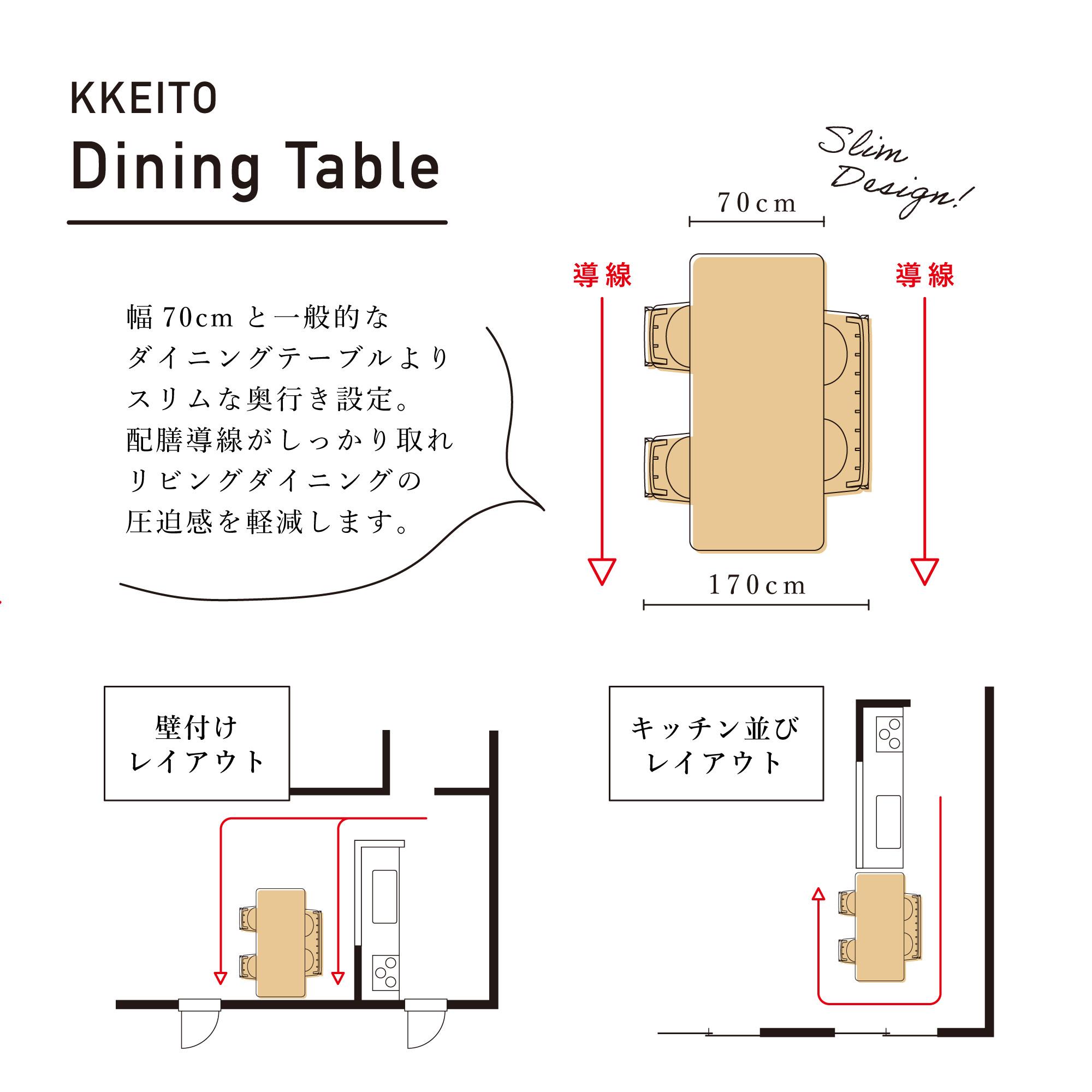 KKEITOのダイニングテーブルの奥行きは70cm。一般的なダイニングテーブルよりスリムなサイズ設定です。
