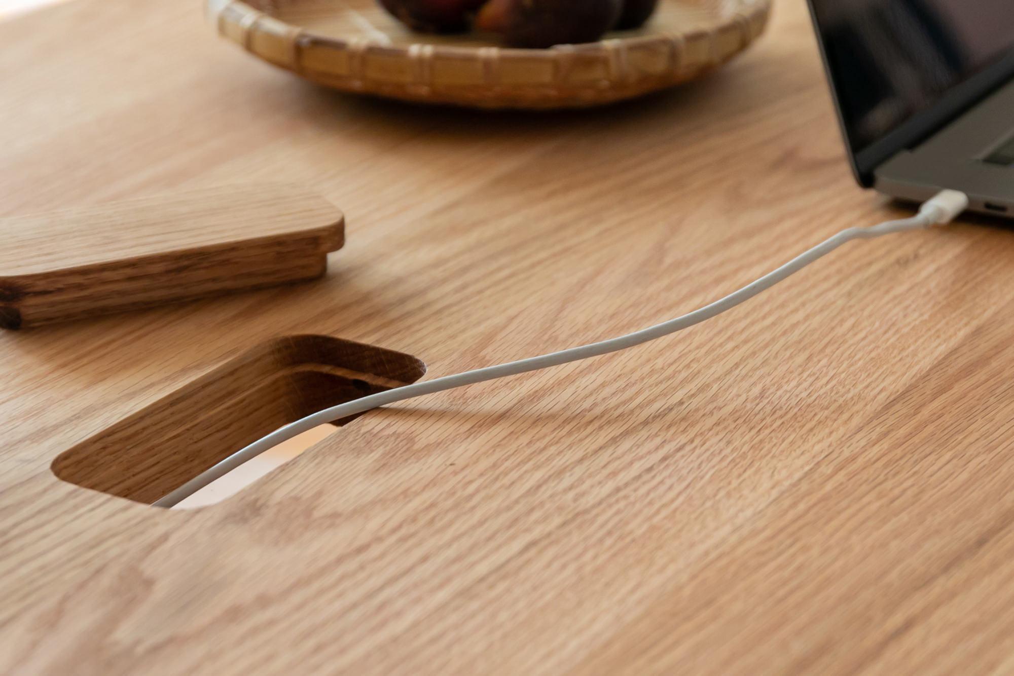 ダイニングテーブルの天板中央に配線穴を設置しました。 ホットプレートなどの電化製品を使う際に、下から電源ケーブルを通してスマートに配線することができます。