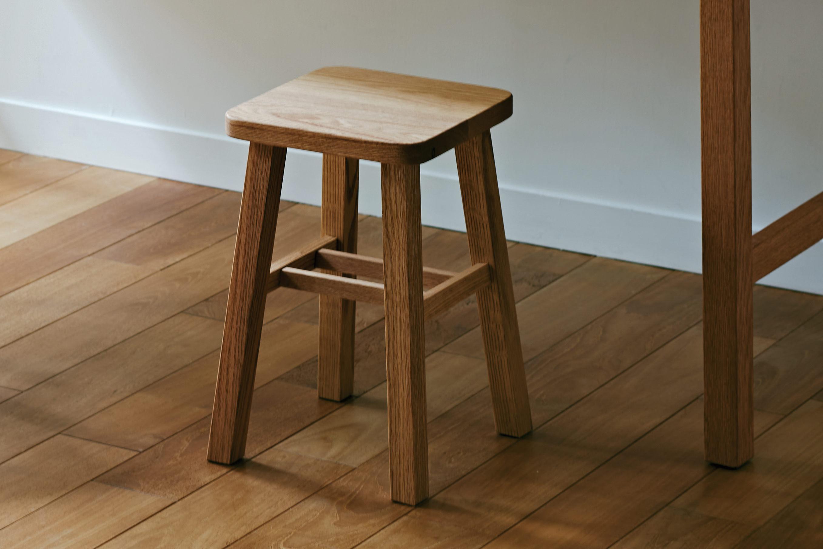 座面がフラットな形状のダイニングスツールとダイニングベンチ。背もたれがない分、レイアウトした際に空間が広々とした印象になります。 足元に貫部材を装着することで強度の確保と物を置けるスペースを兼ねています。