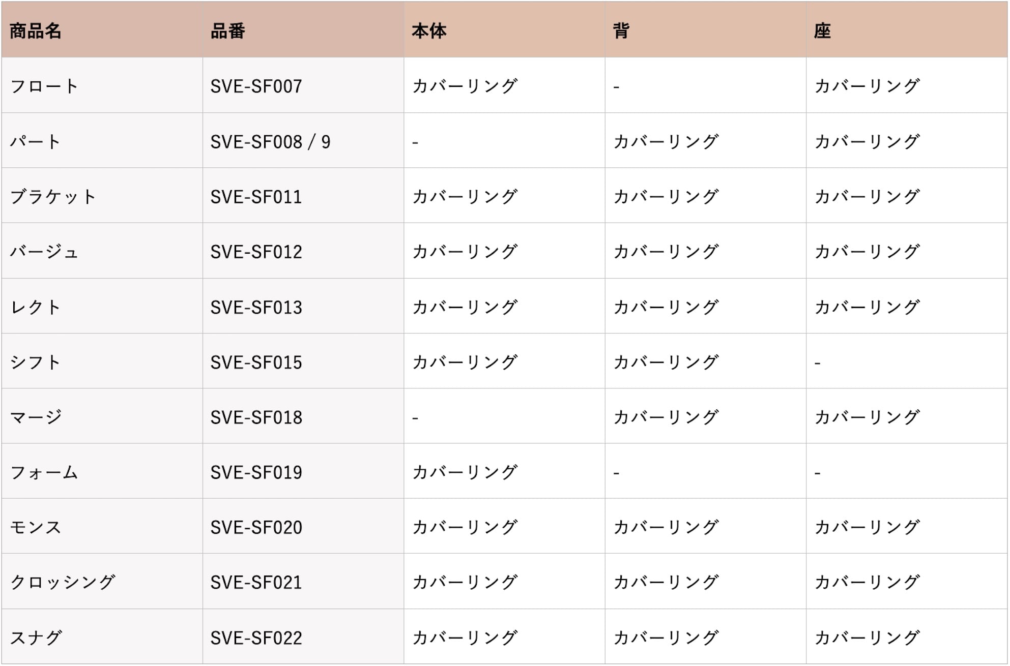 SIEVE ADRS ソファカバー脱着可否の一覧表です