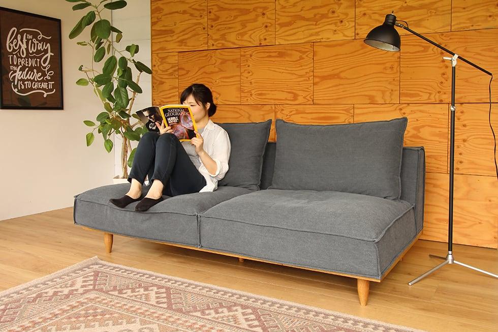 横幅は170cm。肘掛けがないデザインで、足もひっかからずに伸ばせて、ごろ寝も快適に過ごせます。