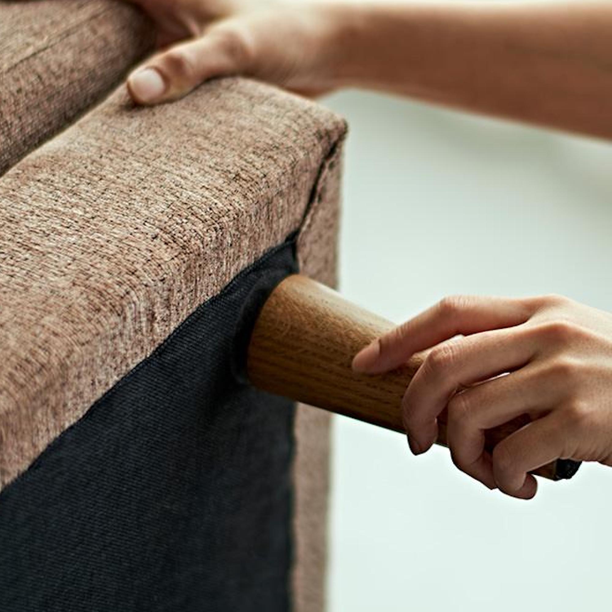 ティナソファの座クッションはマジックテープの固定式で、女性1人でも無理なく外すことができます。