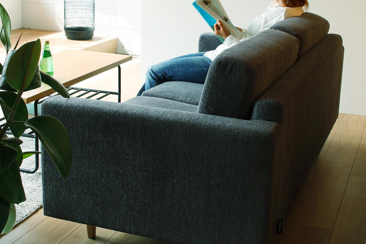 ティナソファの生地は、ほんのり起毛していて触り心地もよく、3色ほど糸がミックスされていて表情豊かな質感です。