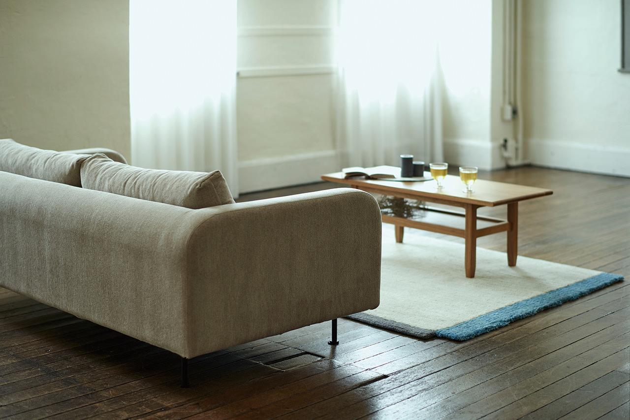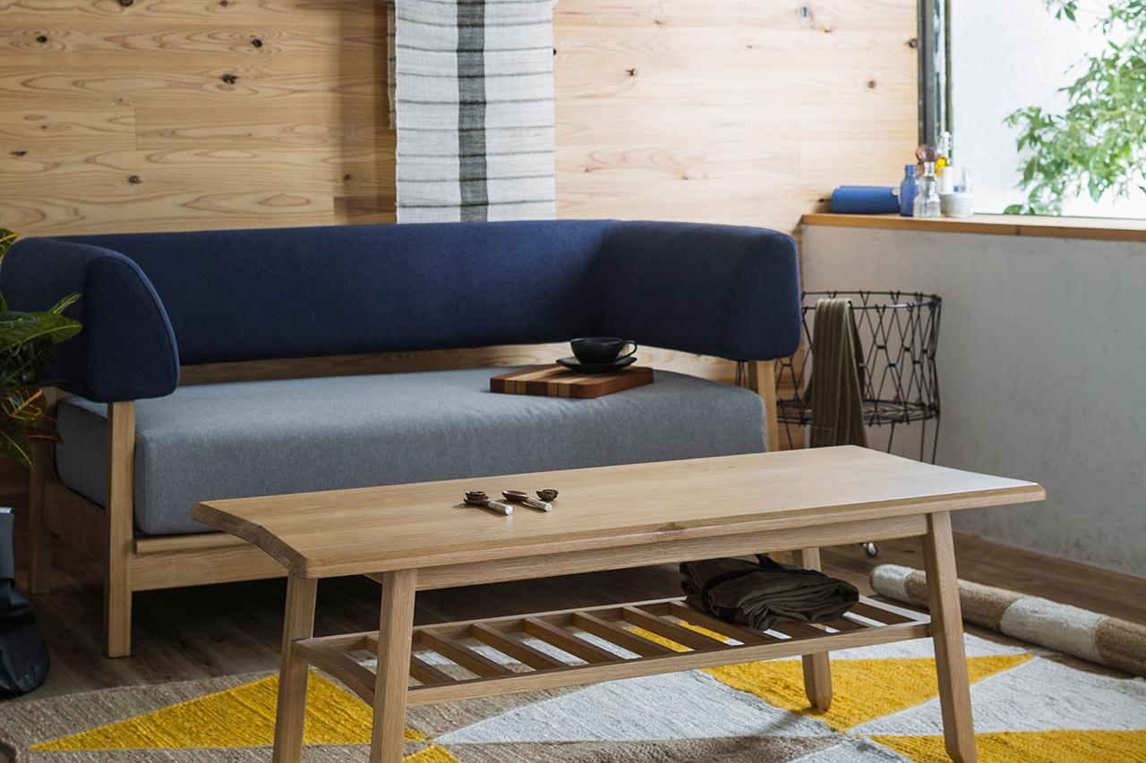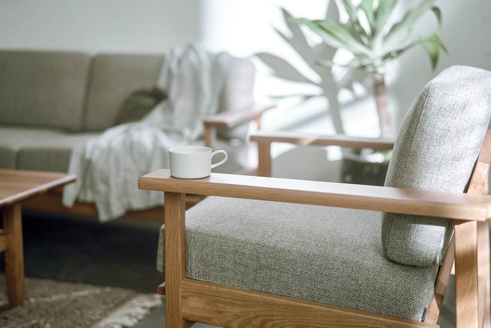 シンプルで凛としたデザインと、天然木のフレーム。そして少し粗め生地を組み合わせた、どことなく懐かしい雰囲気のソファです。