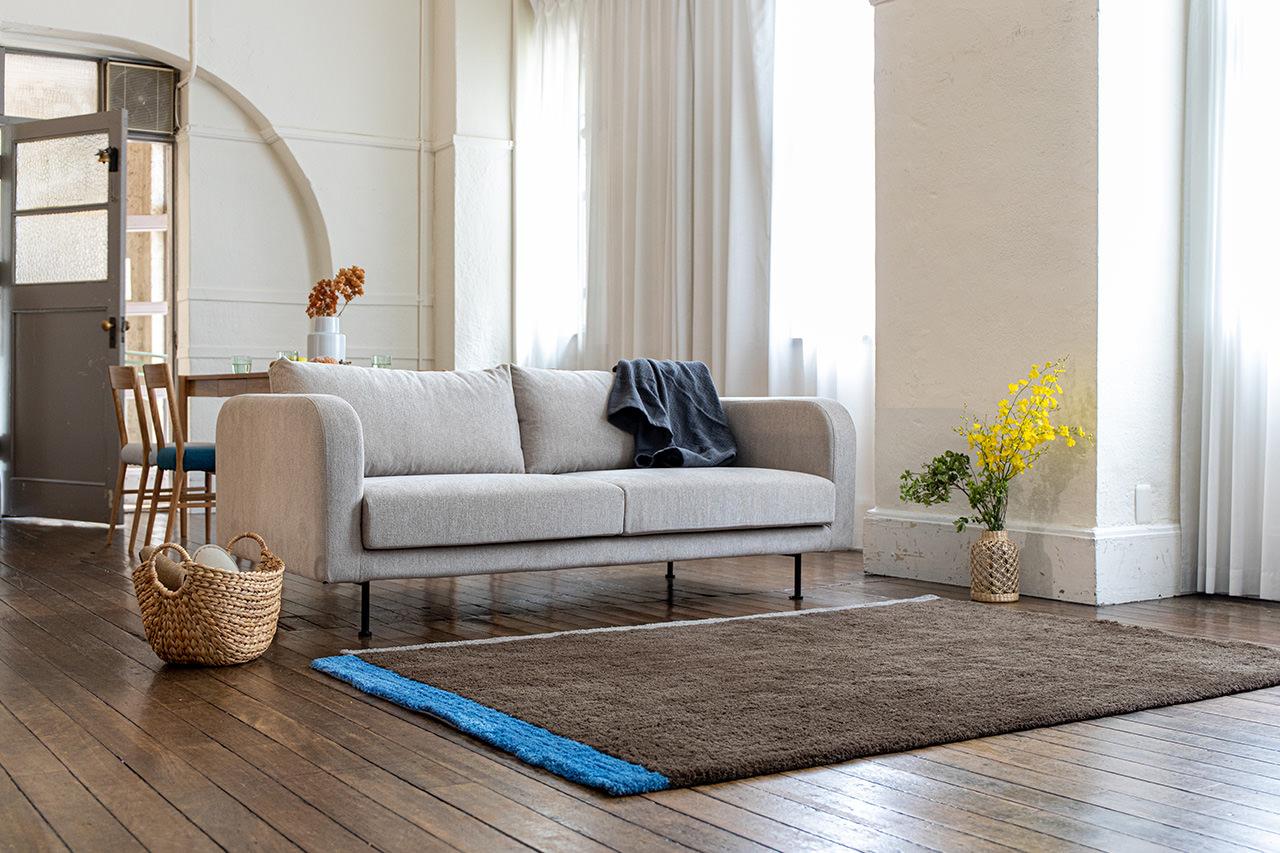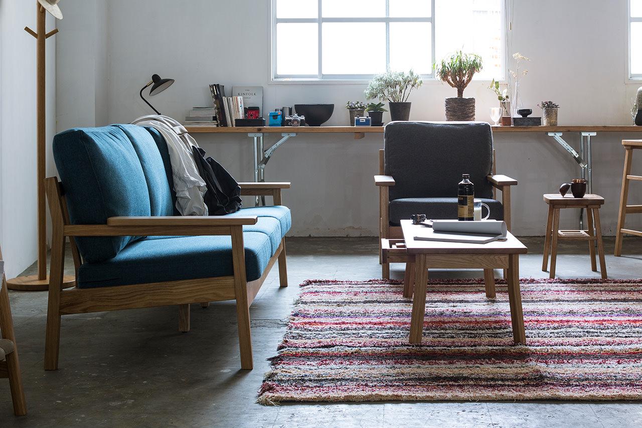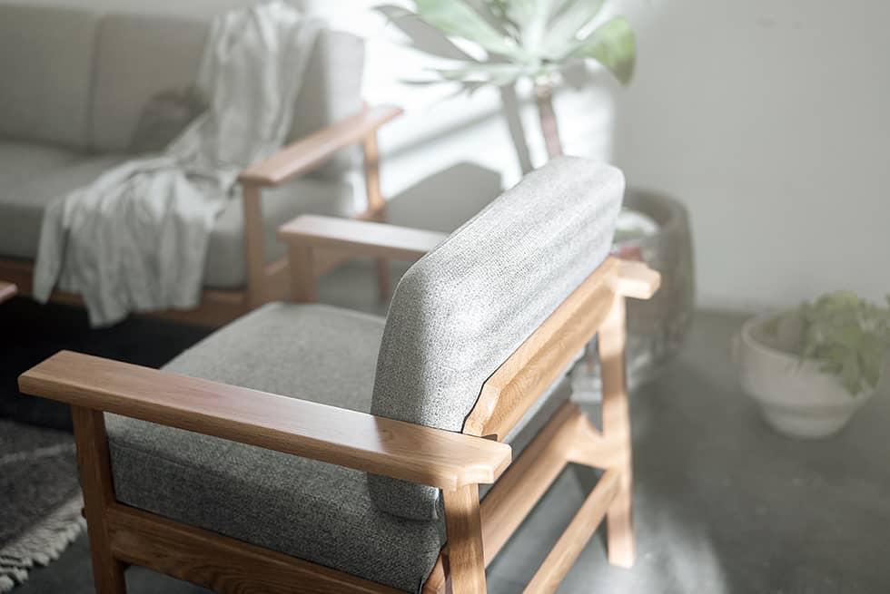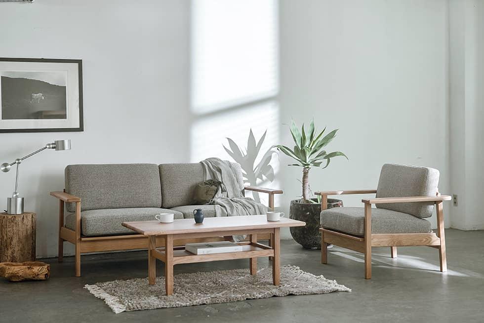シンプルで凛としたデザインと、天然木のフレーム。そして少し粗め生地を組み合わせた、どことなく懐かしい雰囲気のソファです。