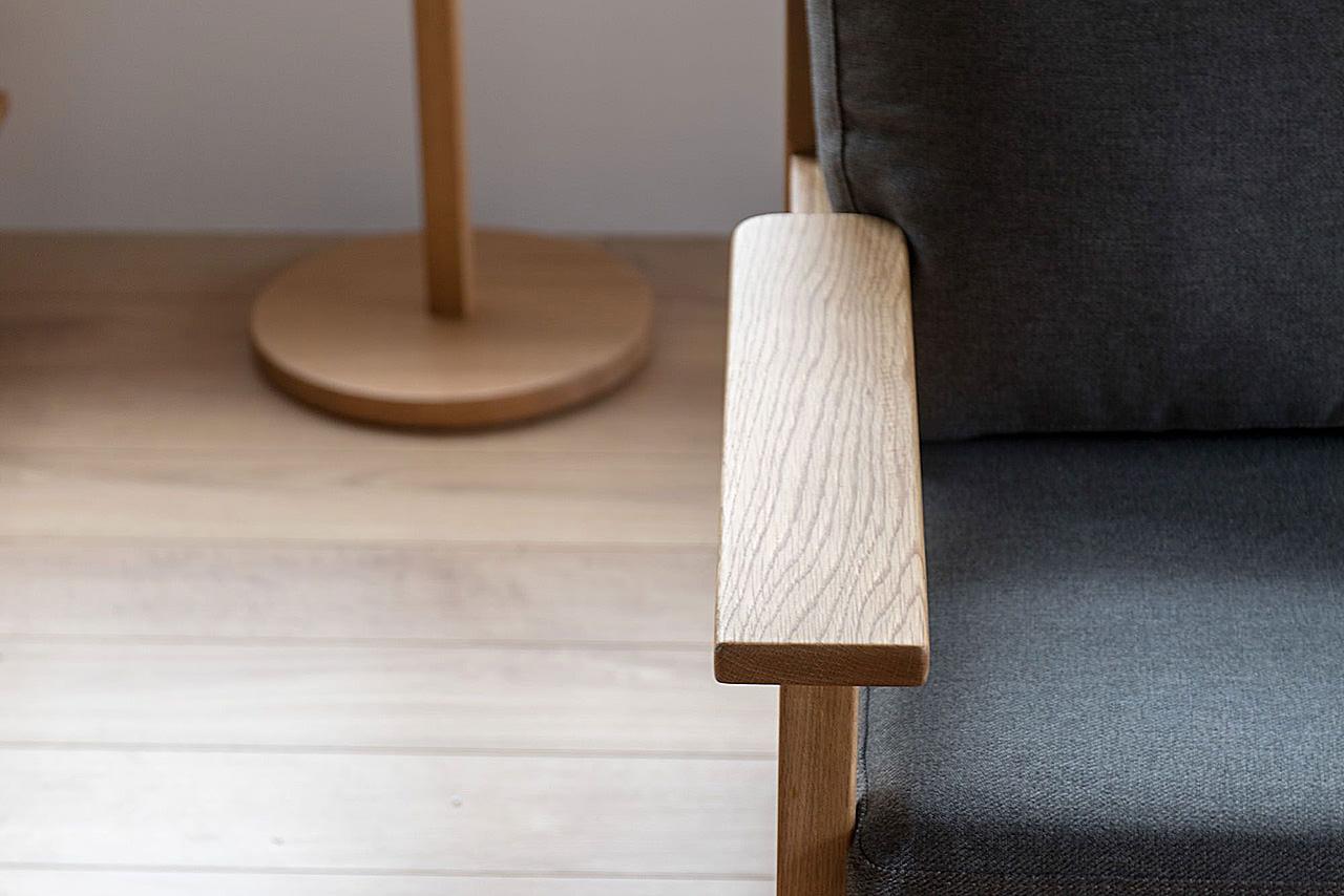 スリムなアームは、肘掛から座面下にかけて同じ幅でつなぎ、すっきりとした印象に仕上げています。