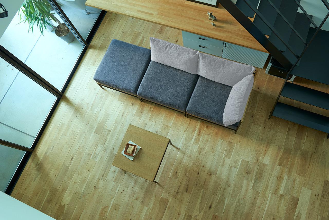 バージュソファは、ふっくらと丸みを帯びたクッション部分と、オーク無垢材の直線的な脚部との組み合わせが美しくいロータイプソファ。