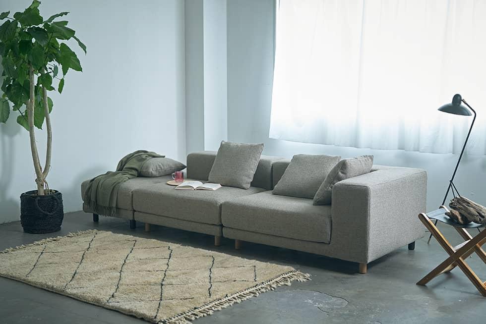4つのアイテムすべての座クッションのサイズを合わせたことで、様々な組み合わせが可能なスナグユニットソファ。