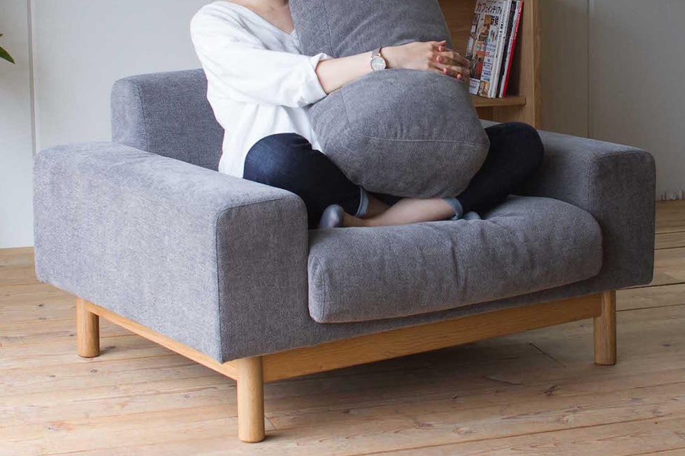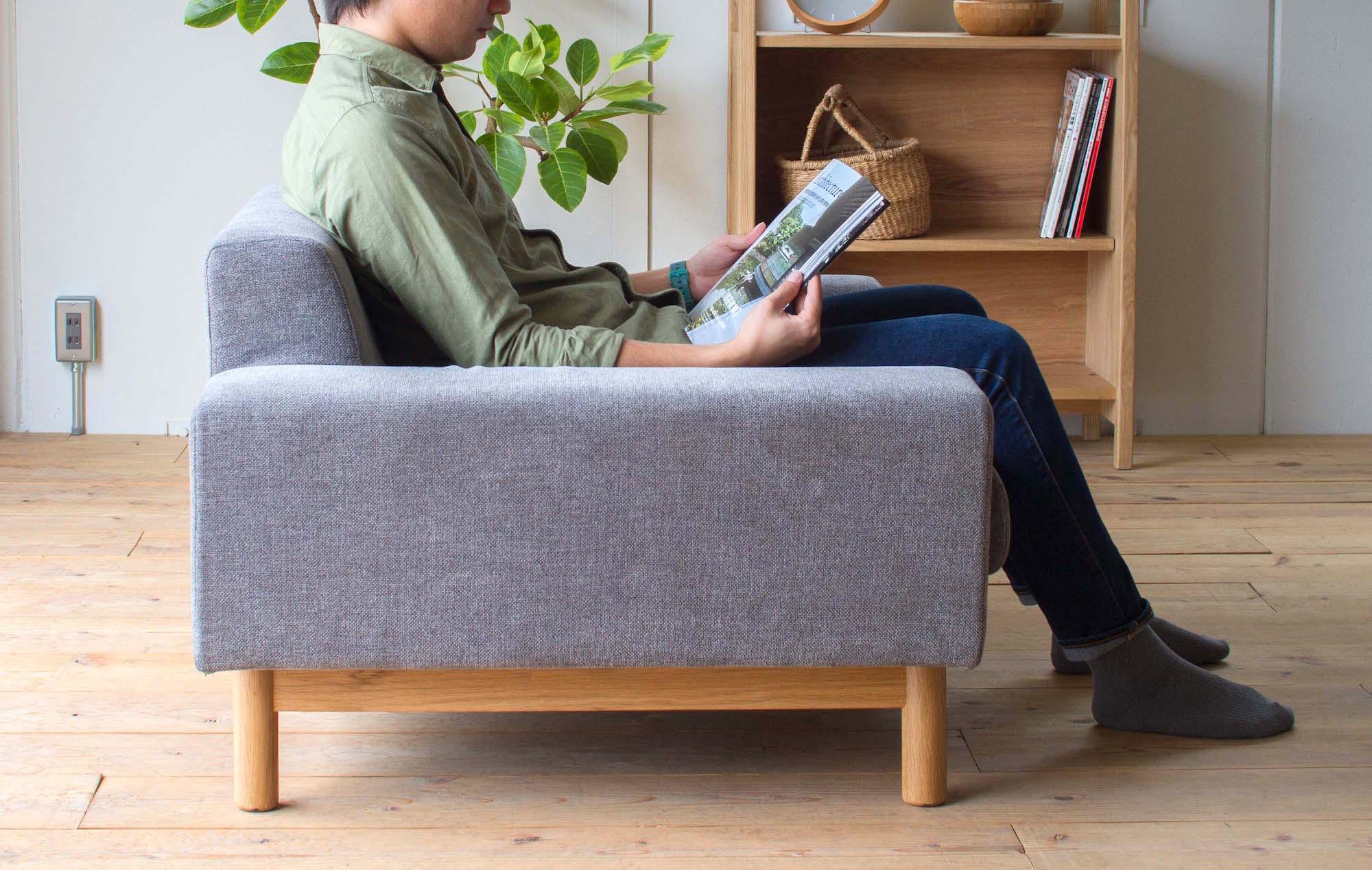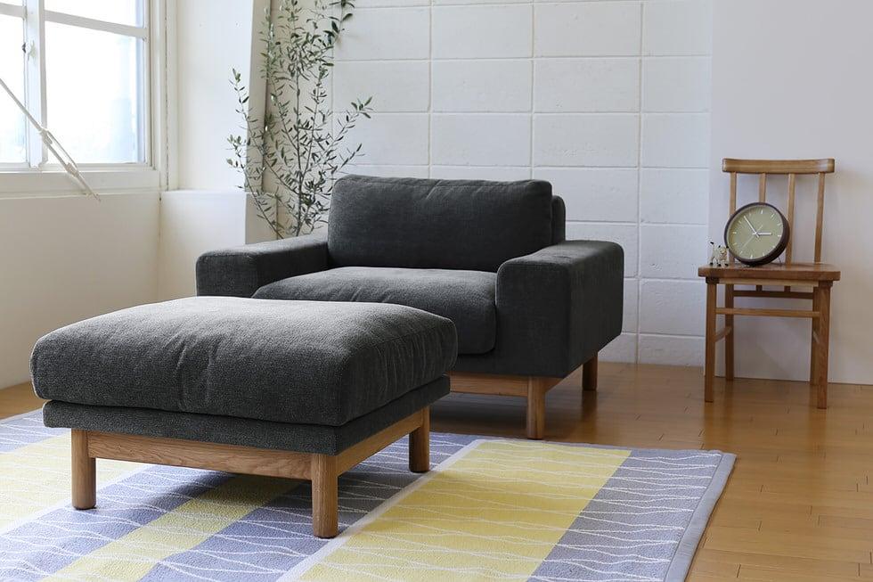 ふっくらと丸みを帯びたクッション部分と、オーク無垢材の直線的な脚部との組み合わせが美しく、 オーク材の落ち着いたナチュラル色は、センターテーブルやローボードなどの木製家具と合わせやすい色目です。