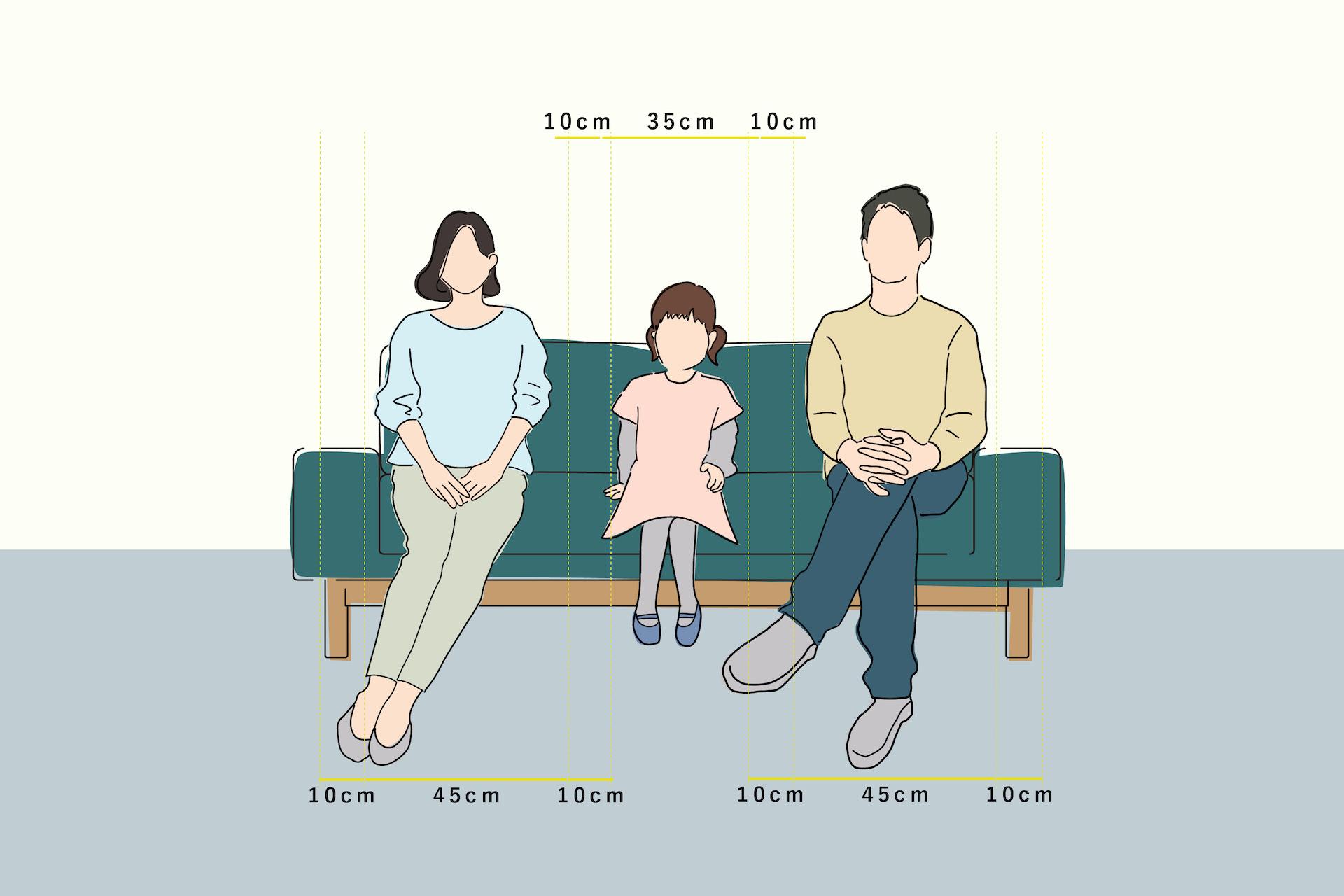 家族で座る場合は、ある程度密着して座っても気にはならない方も多いと思いますので、目安としてご参考にしていただければと思います。