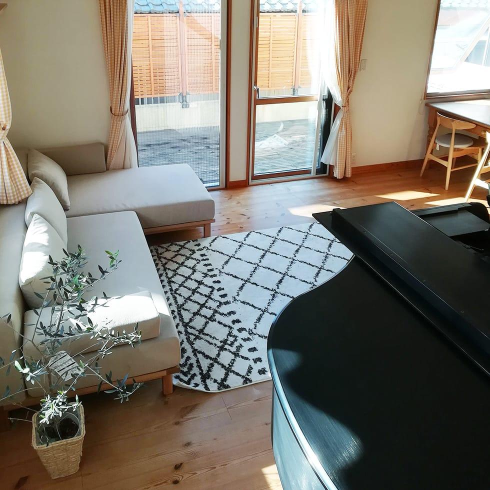 N様のお部屋では、ソファが腰高窓の前に配置されています。