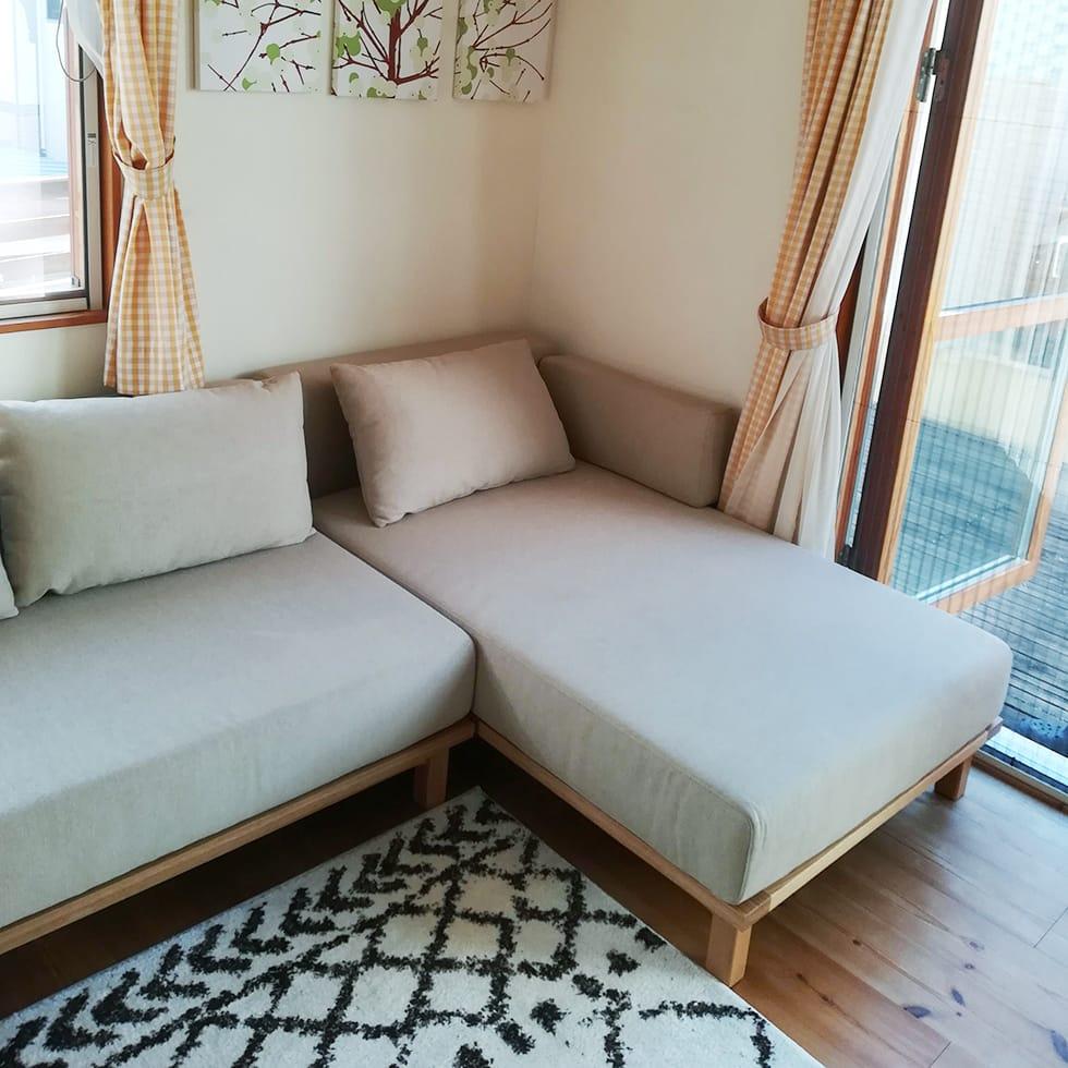 レクトユニットソファのベージュ色は、木目との相性も良く、お部屋が優しい印象になりますね。