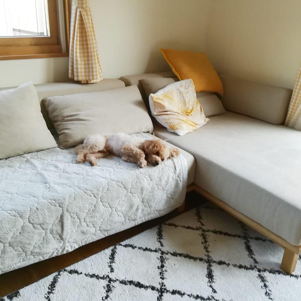 "ソファがお気に入り過ぎて… うちのワンコが汚さないようにスローケットを敷いて使っています。"