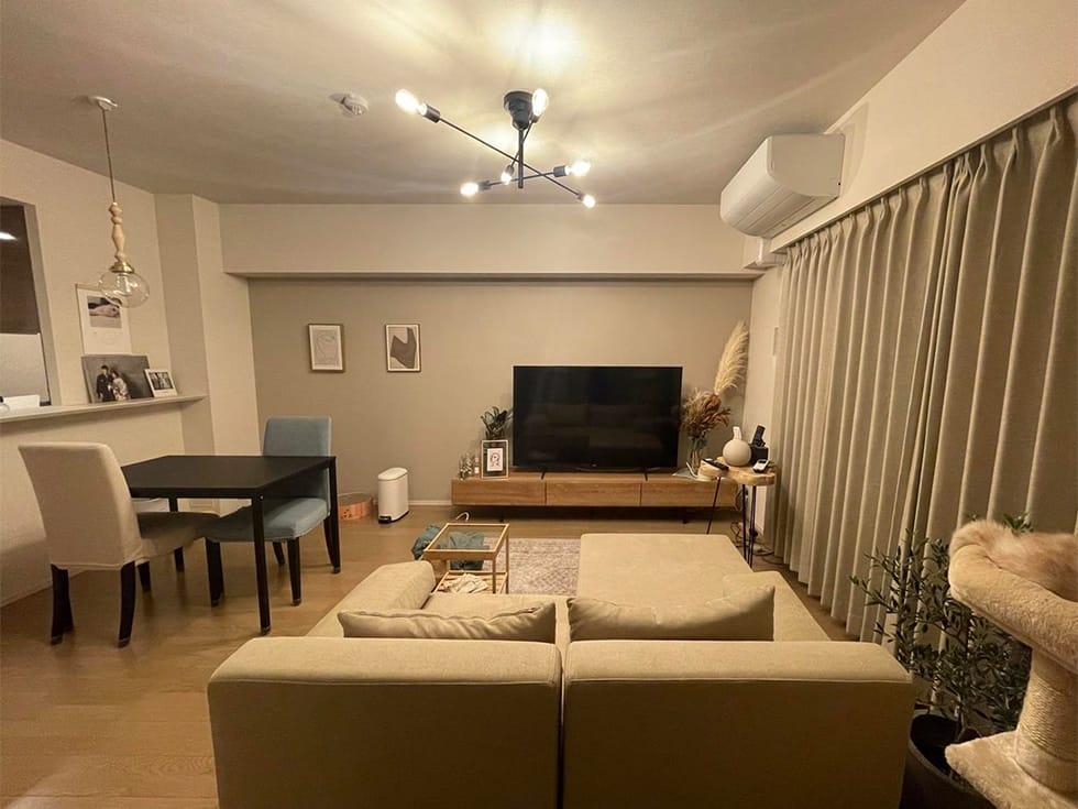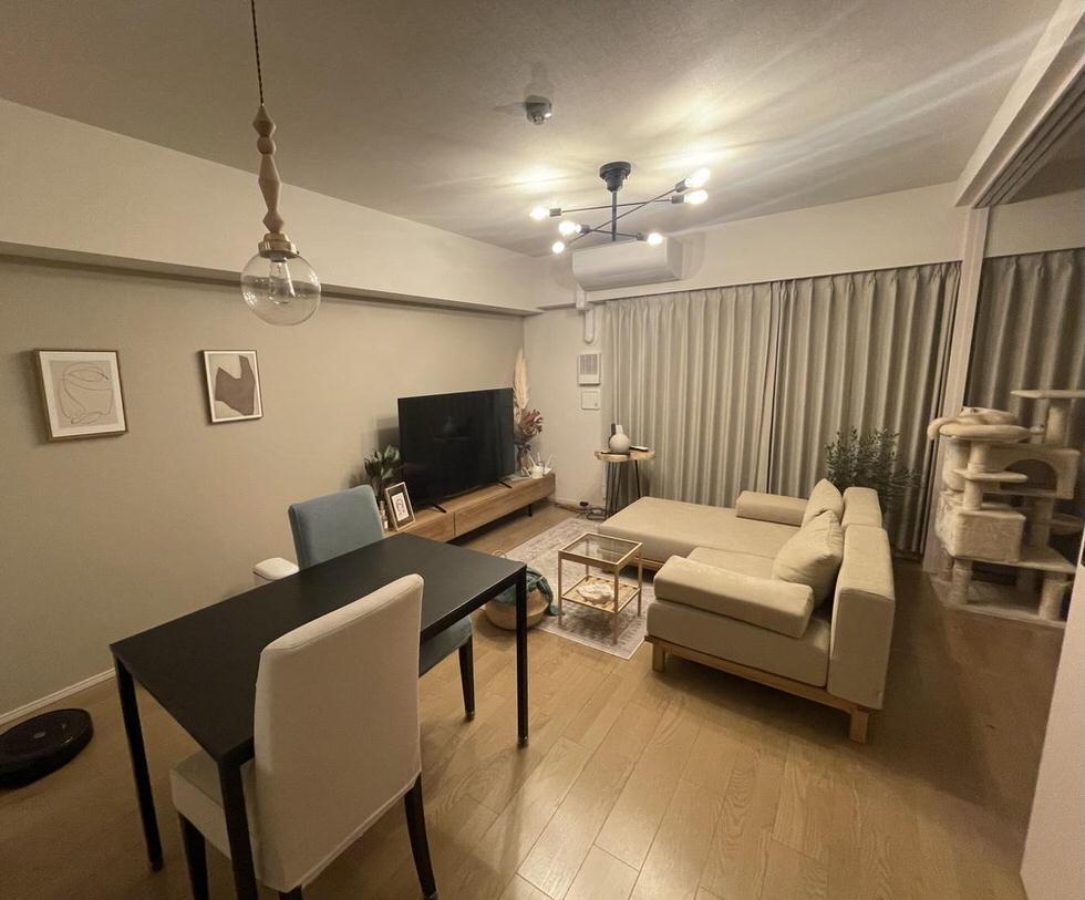 ソファやダイニングチェア、キャットタワーのベージュ色と、木目が優しい印象ですが、濃い色味の天井照明やダイニングセットをアクセントに、メリハリのあるコーディネートに仕上げていらっしゃいます。 温かみがあって、とっても落ち着けそうなお部屋ですね。