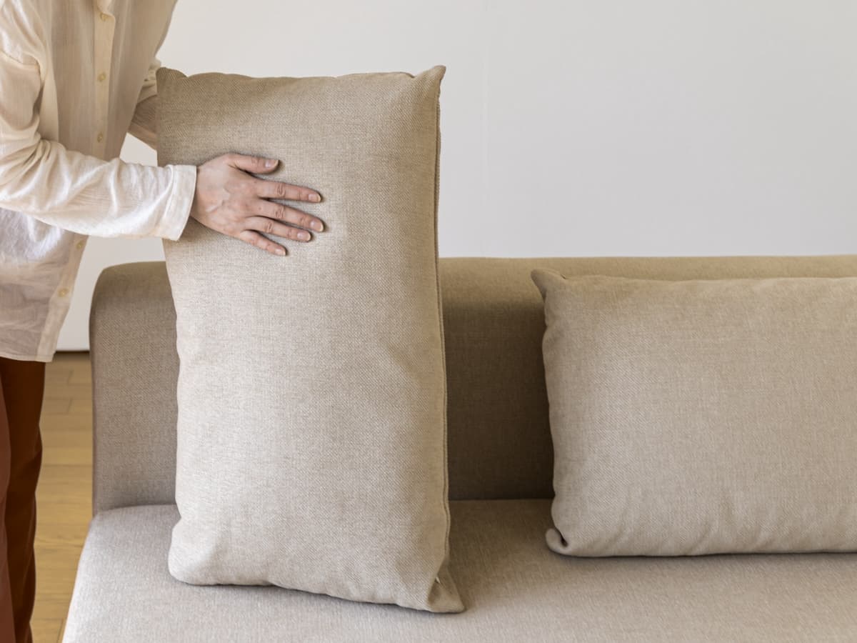 カバーとクッションの大きさ、形状(表裏・前後)を確認し向きを揃えます。