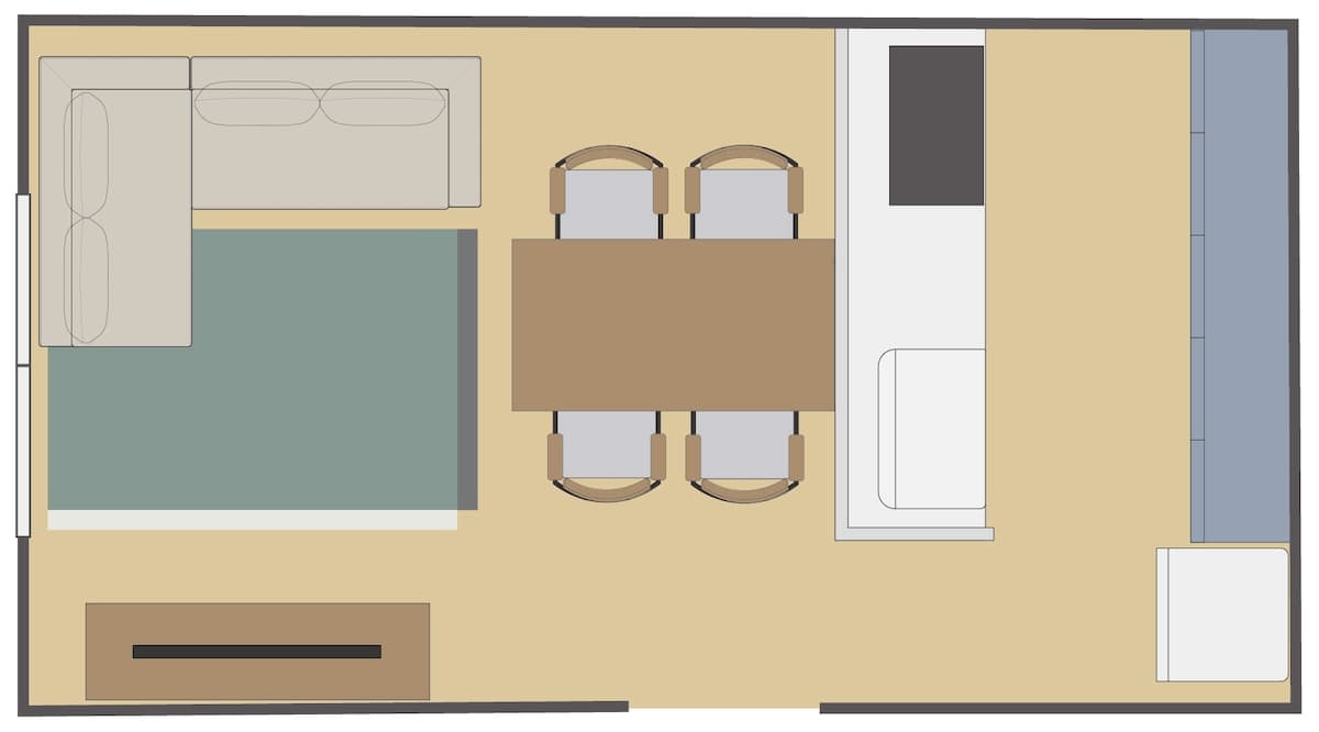 ソファとダイニングを置いた場合、生活動線となる通路のサイズが狭く、窮屈な印象がありますが、