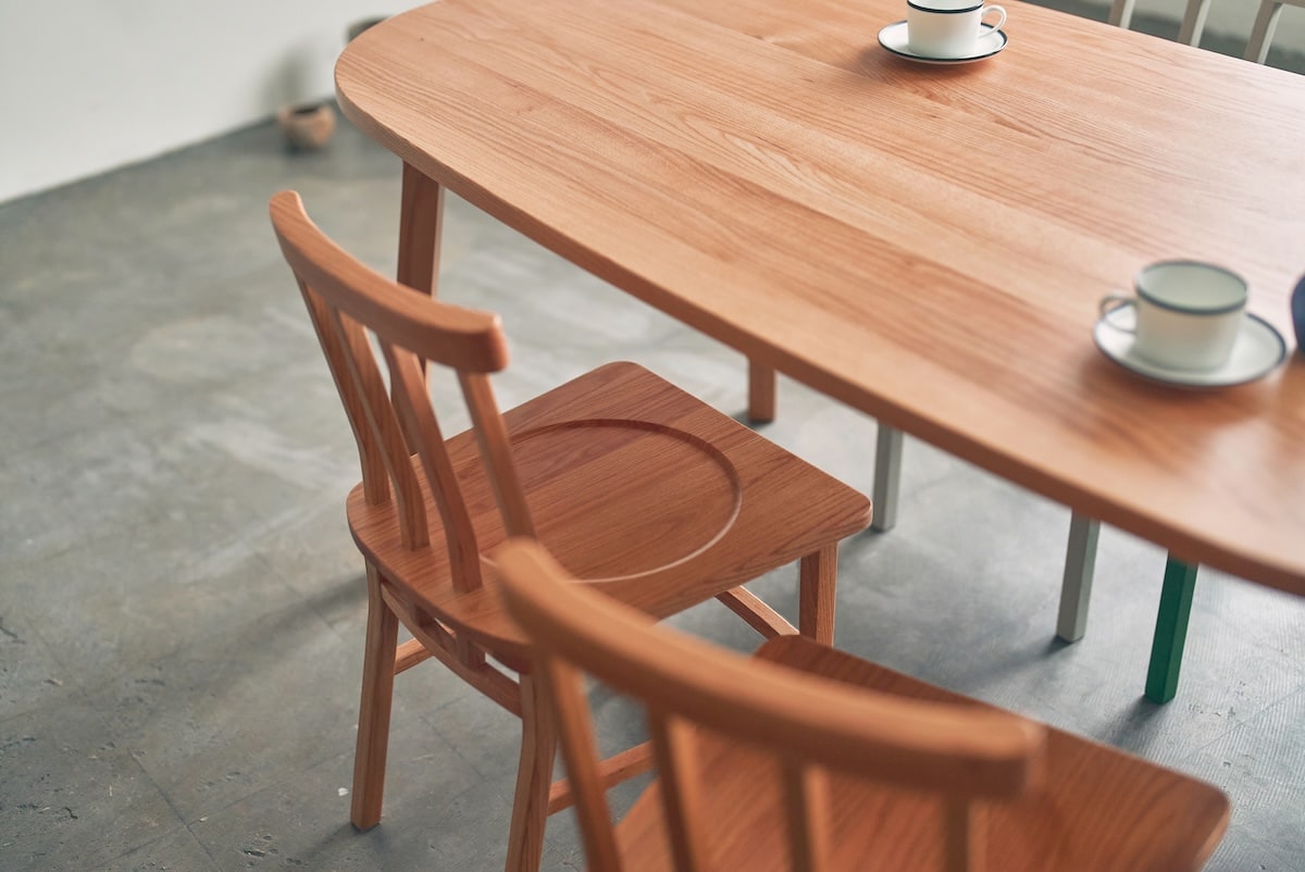 チェアは背のスポーク本数やカラー違いなど、全4タイプをラインナップ。組み合わせ次第で表情が変わり、自分らしいダイニングをつくる楽しさがあります。
