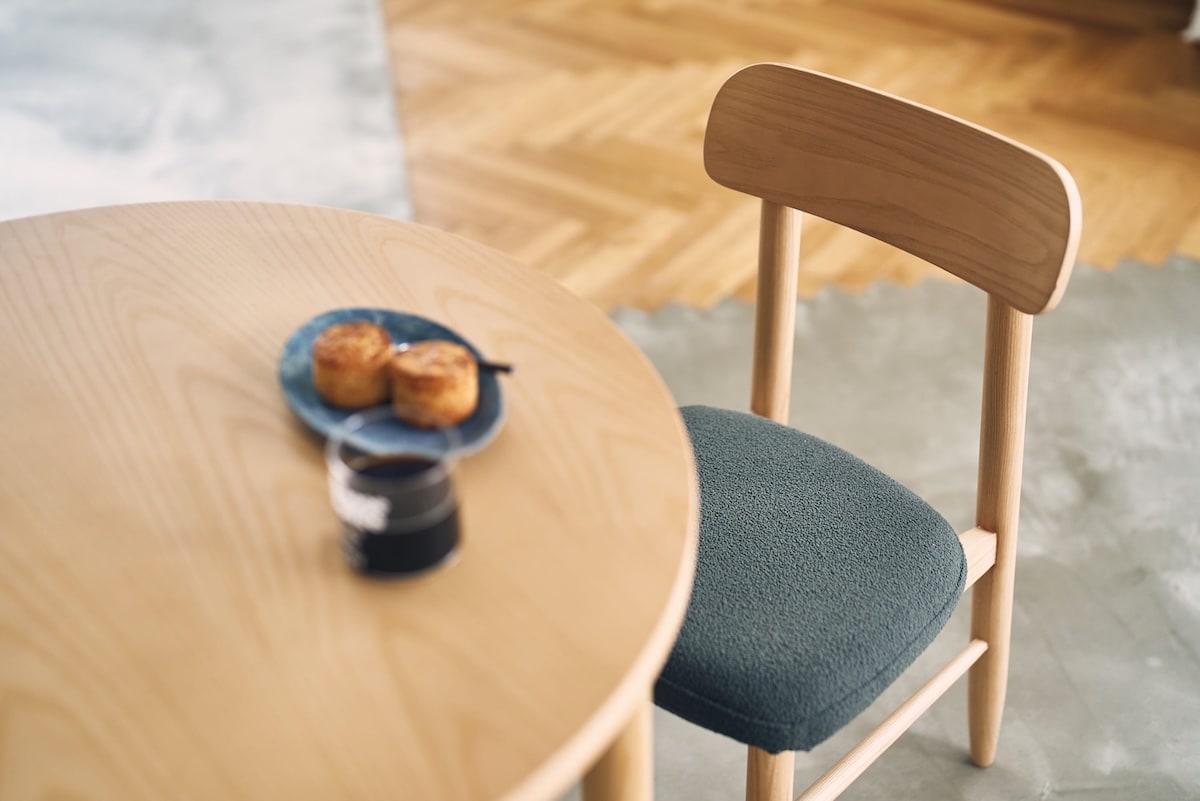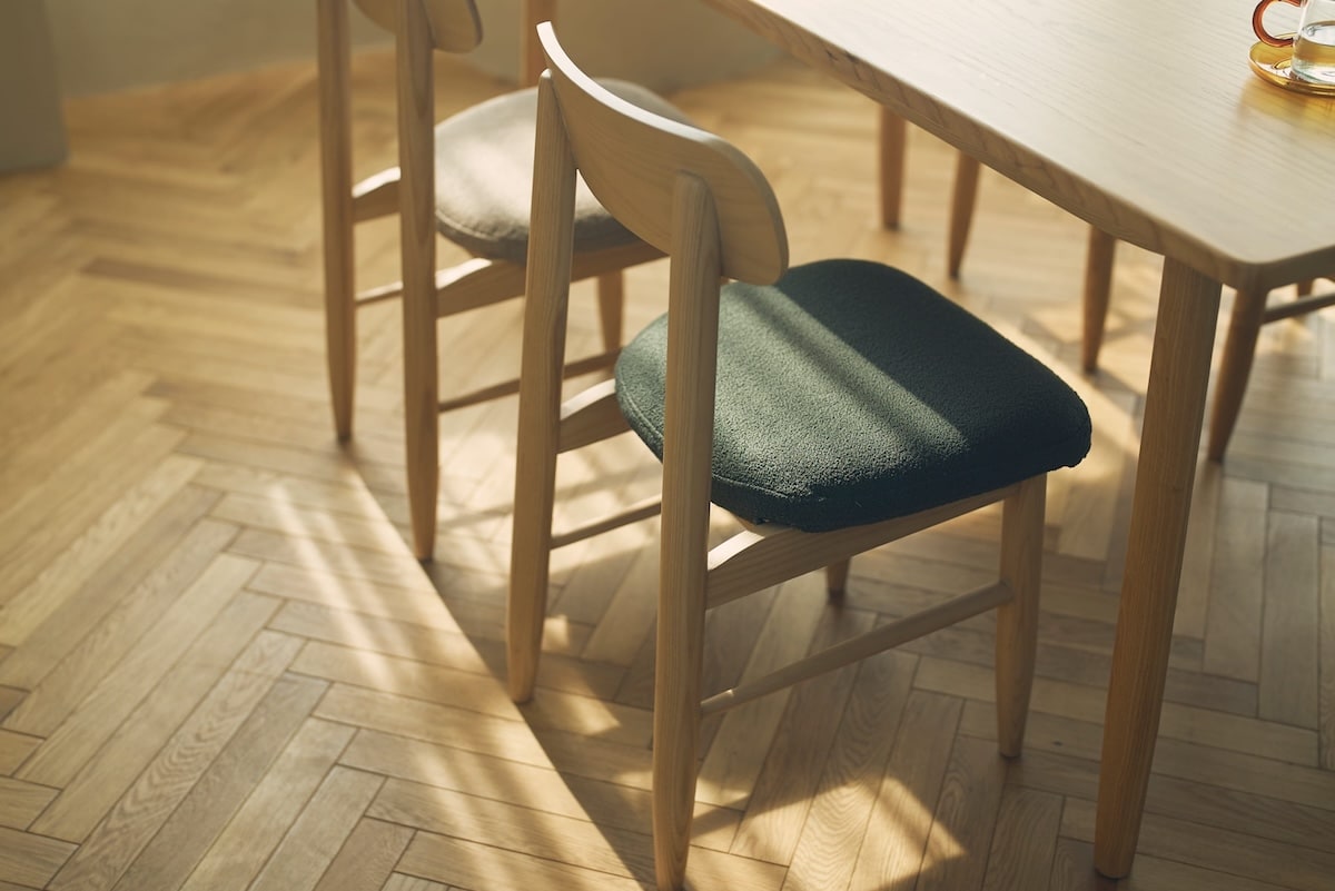 チェアは小さな肘を天板に掛けられる設計で、お掃除や片付けも快適に。カバーリング仕様と板座仕様から選べ、日々の暮らしに合わせた心地よさを叶えます。