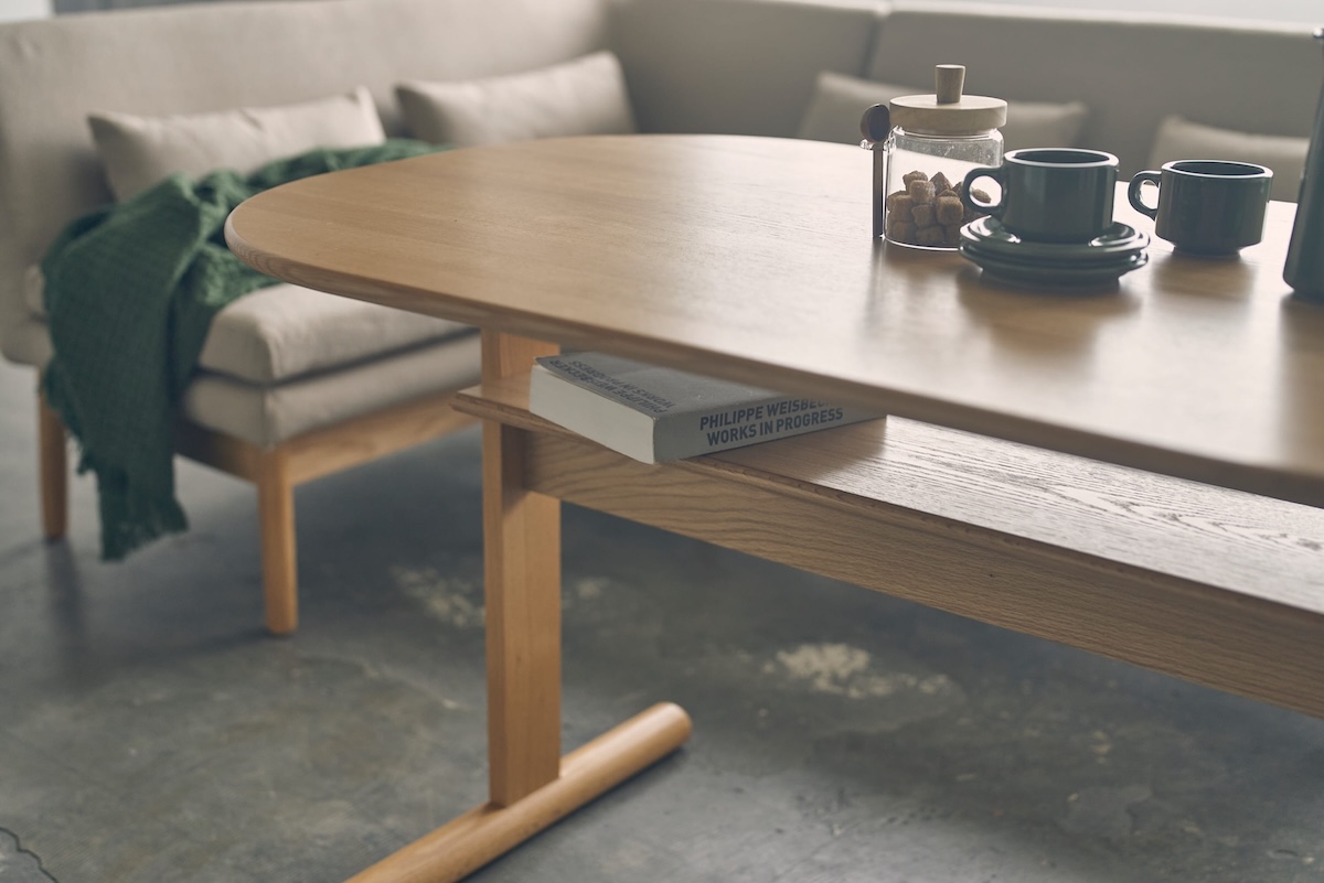 テーブルは、直線的で軽快な脚と、角に丸みを持たせた天板が特徴。長方形タイプに加え、人数や暮らしに合わせて選べる円形テーブルを展開し、少人数からファミリーまで幅広く対応します。