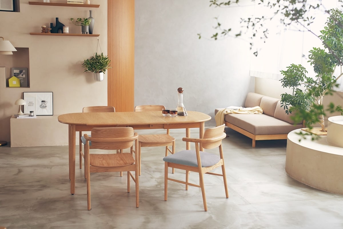 nookシリーズは、丸みを帯びたやさしいフォルムと、オーク材のぬくもりが調和した北欧ナチュラルなダイニングシリーズです。普段はコンパクトに、必要なときには広々と使える伸長式テーブルは、家族の成長や暮らしの変化に寄り添う一台。天板は内部に収納でき、すっきりとした佇まいを保ちます。