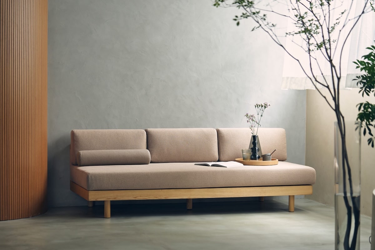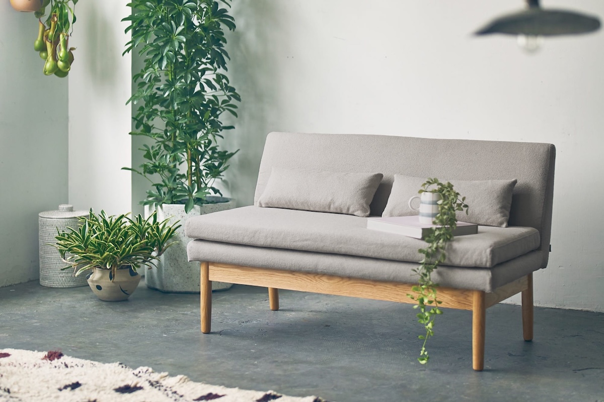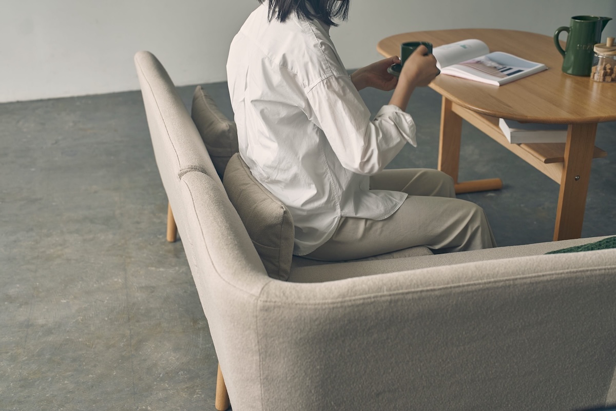 オーク無垢材のフレームと、表情のあるファブリックが、ナチュラルで落ち着いた佇まいを演出。
